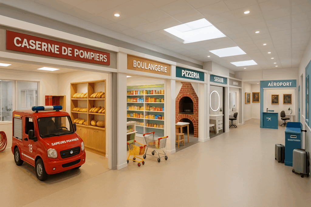 Dans notre mini-ville enchantée, les enfants deviennent de véritables héros du quotidien ! Pompiers, médecins, commerçants… chaque espace est une aventure où l’imaginaire prend vie.